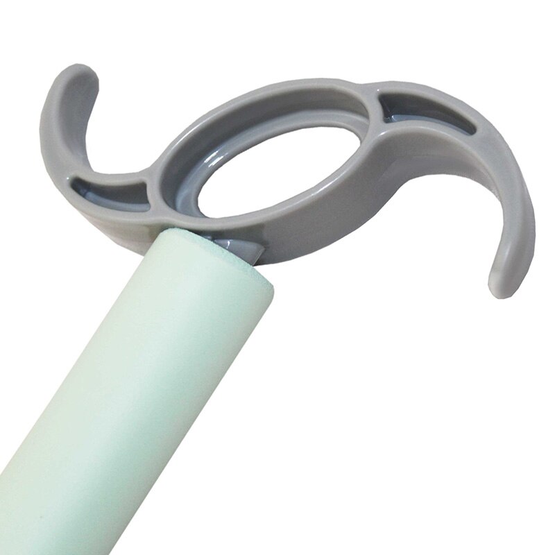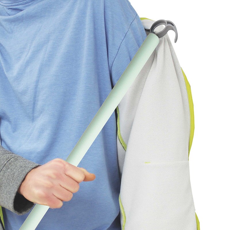 Designed with a plastic push-pull S-Hook at one end and a long handled shoe horn at the other end. A large comfortable foam grip covers the handle.