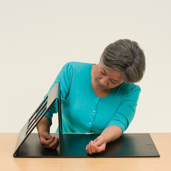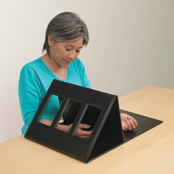 Ideal for both clinic and home use. Used to treat upper extremity pain and limited motion due to phantom limb, hemiparesis, arthritis, complex regional pain syndrome or following hand surgery. Helps enhance motor planning and reduce kinesiophobia. The SMART-Mirror™ can be used for mirror therapy or as the final stage of graded motor imagery. Innovative features include: - The ability to position the mirror between 90° - 65° for individualized viewing comfort. - Easy setup for one-handed use while in the clinic or at home. - The three ventilation windows assists with air flow and allows therapists to observe movement. - Sleek design offers function, mirror protection and compact storage. May be cleaned with a soft, clean cloth or with a mild soap and water solution. Visible shatter-proof mirror area measures 8 x 13.4". Weight: 2-3/4 lb