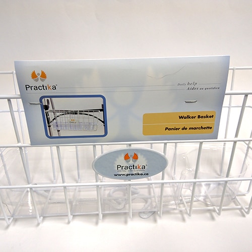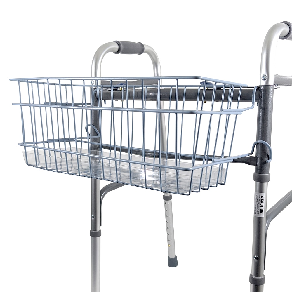 This adaptable walker basket can be installed on the top or lower cross bar depending on your model. Includes a clear plastic insert tray with cup holder to keep small items from falling through the basket. Can be securely attached to the walker. 16.25 x 5.5 x 7”.