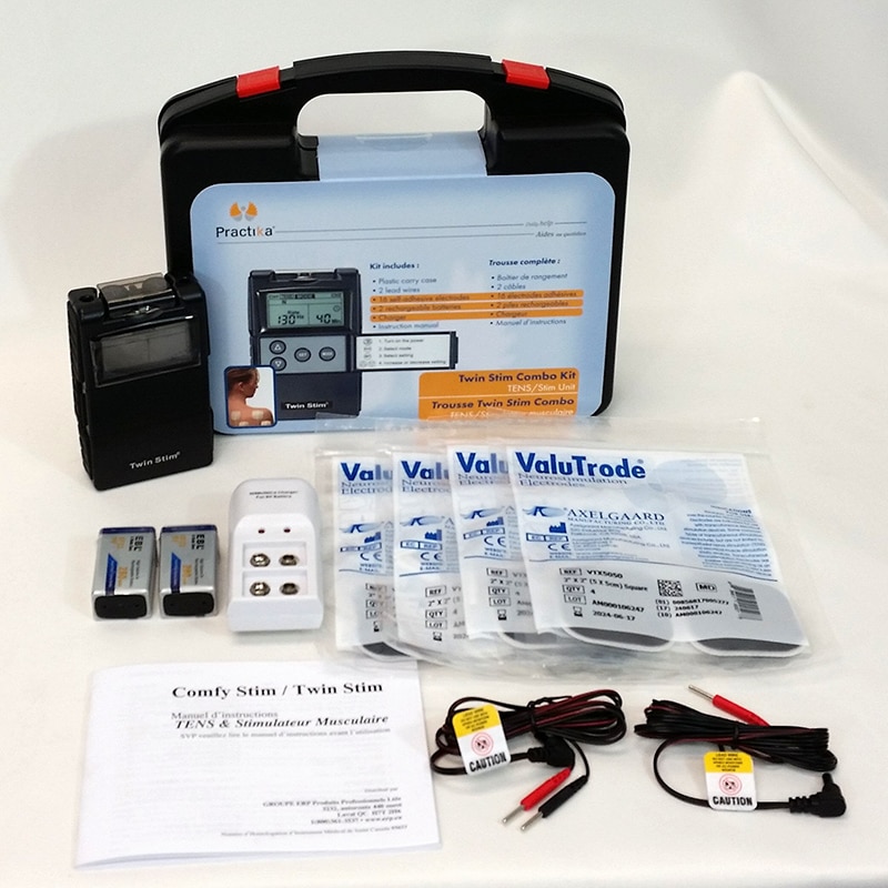 In the Twin Stim Combo Set, the Twin Stim device is offered with everything the patient needs for several months of use: rechargeable batteries 9 volts (2), charger and 4 sets of adhesive electrodes(16).