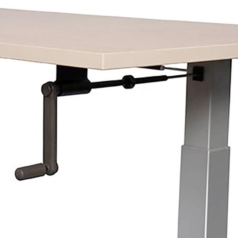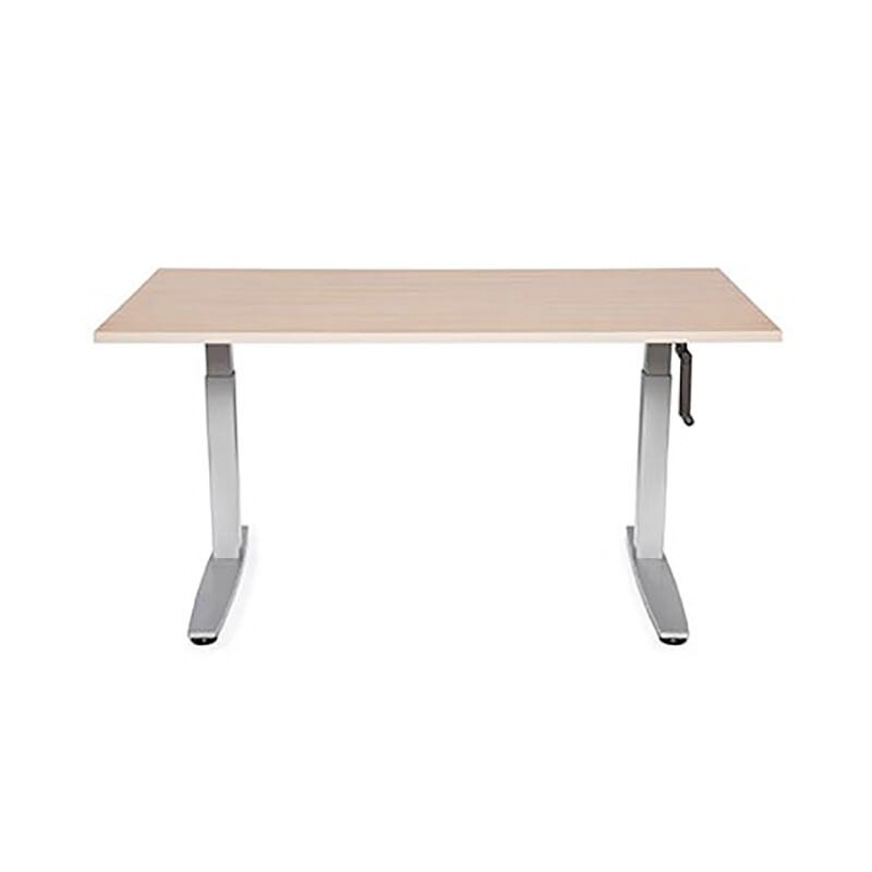 An ergonomic workstation with a clean modern look, smooth hand-crank adjustment, and variable sit-to-stand height adjustment. FEATURES: - Single surface workstation with vertical height adjustment for individual positioning or multi-user environments - Easy to turn hand-crank adjustment - Hand-crank is positioned under the table and retracts out of the way - Meets or exceeds ANSI/BIFMA standard, BSR/HFES 100 standard, and ANSI A 117.1 (wheelchair accessibility) standard - Durable laminate top TECHNICAL DATA: Vertical adjustment range 24“-38”, 7 cranks per inch 14 guage steel feet coated in Graphite Silver powdercoated finish Anodized aluminum telescoping legs