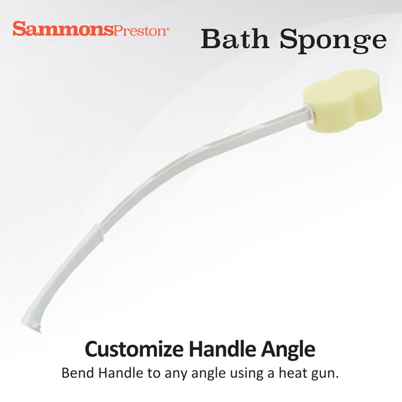 Long Handle Reduces Excessive Reaching Sammons Preston Bath Sponge is an extra long handle with a sponge attached at an angle to help extend your reach with minimal exertion. Ideal for caregivers and those who have a limited range of motion, as well as with those who can’t perform reaching movements or extend their arms. Made from recycled plastic, the long handle measures 26" in total length. Heated and Angled for Increased Comfort Users with limited shoulder motion will find it is difficult to reach the middle of their back when using a straight handle bathing sponge. The handle can be customized and angled using a heat gun, increasing comfort and making it easier to wash the back. Designed to improve hygiene, the bath sponge helps reduce the amount of bending, reaching, and twisting to limit the amount of strain placed on the body. Features Soft, Non-Irritating Foam Sponge In addition to reducing excessive reaching, the long handle is easy to hold and enhances grip while bathing and showering. The contoured bath sponge, shaped similar to an hourglass, measures 5 inches long and 2 inches thick. The bath aid features a soft, non-irritating foam sponge that gently cleanses sensitive skin and is treated with an antibacterial agent prolonging the life of the sponge.
