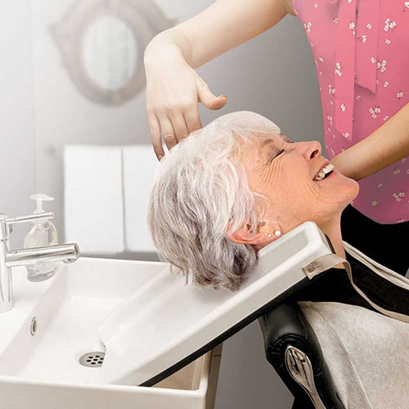 Contoured to fit neck comfortably and rest on the user's shoulders for easy shampooing in a seated position. 35" nylon strap wraps around the user's forearm to stabilize tray. Raised edges allow water to drain into the sink without making a mess. Durable plastic construction. Can be used with chair or wheelchair. Size: 12.75 x 17 x 1.38"