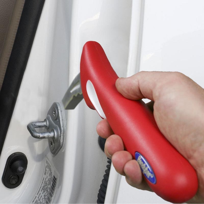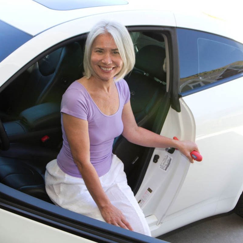 Protects against falls and makes standing or sitting easy. HandyBar fits perpendicular to the car for a comfortable grip and optimal leverage. Features: - Ergonomic rubber grip - Secure fit into passenger or driver side of door latch, no vehicle modification required - Cuts the seat belt in case of an emergency - Fits all car types - Capacity 350 lb
