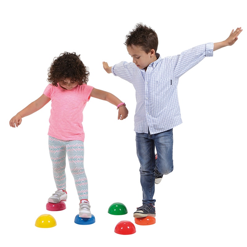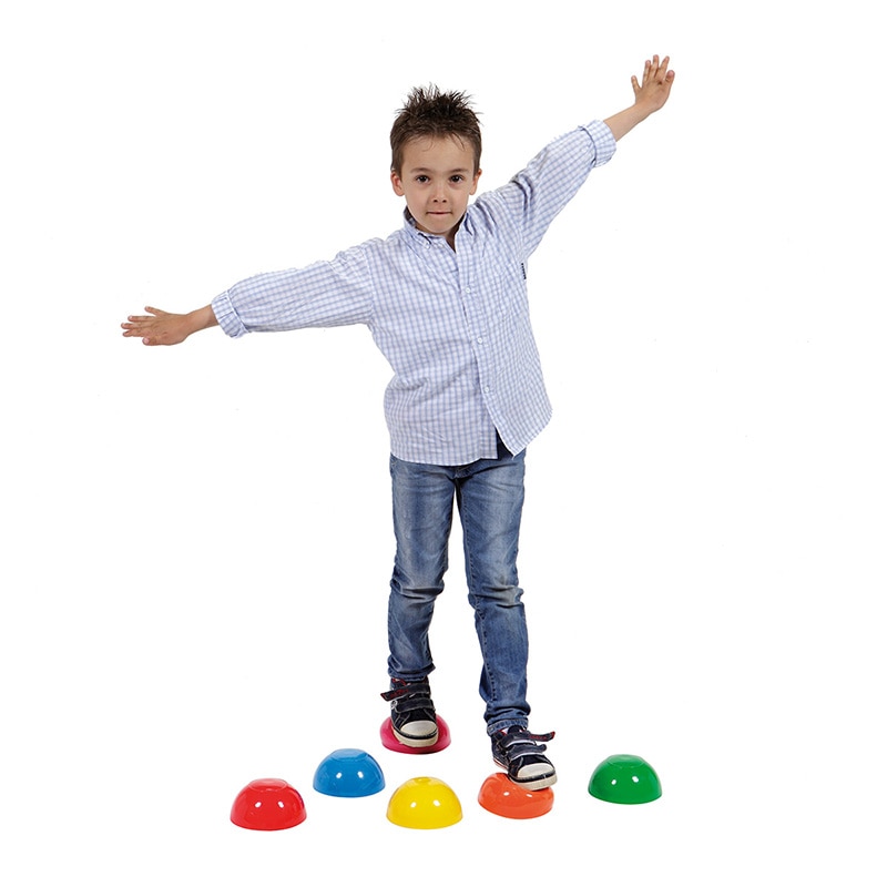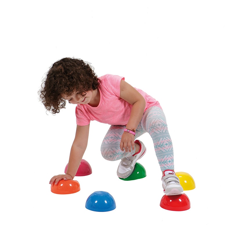 Ideal to develop balance and proprioception, the Junior Stones hemispheres can be used to play in groups and create paths thanks to the assorted colours. One set is made of six hemispheres. Diameter 14 cm Height 6 cm Capacity: max. 90 kg (200 lb) Needle pump required for inflation. Adult supervision is required.