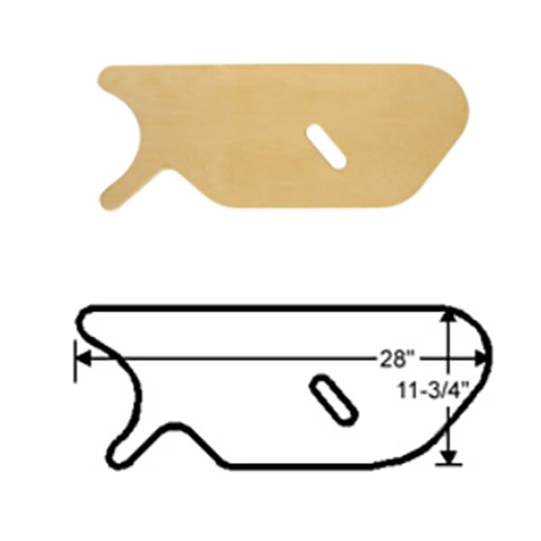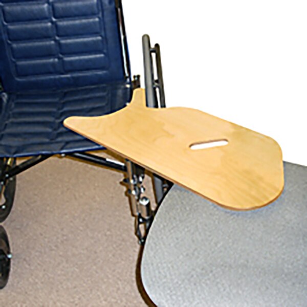 This lightweight 7-ply 3/8" thick birch board is clear sealed. With the armrest removed the contoured shape fits around the wheel on the wheelchair for ease when transferring. Place the triangular cutout against the wheel to help hold the board in place. Specifications: .Measures: 11-3/4"W x 28"L .Weighs: 2.4 lbs .Weight capacity: 250 lbs
