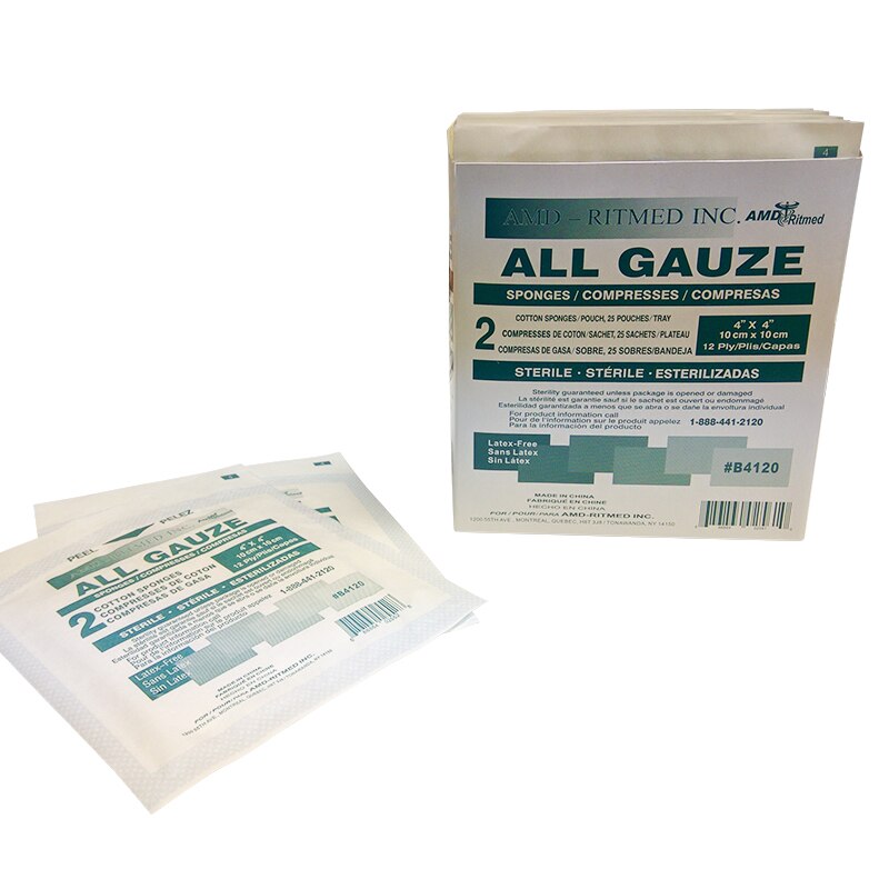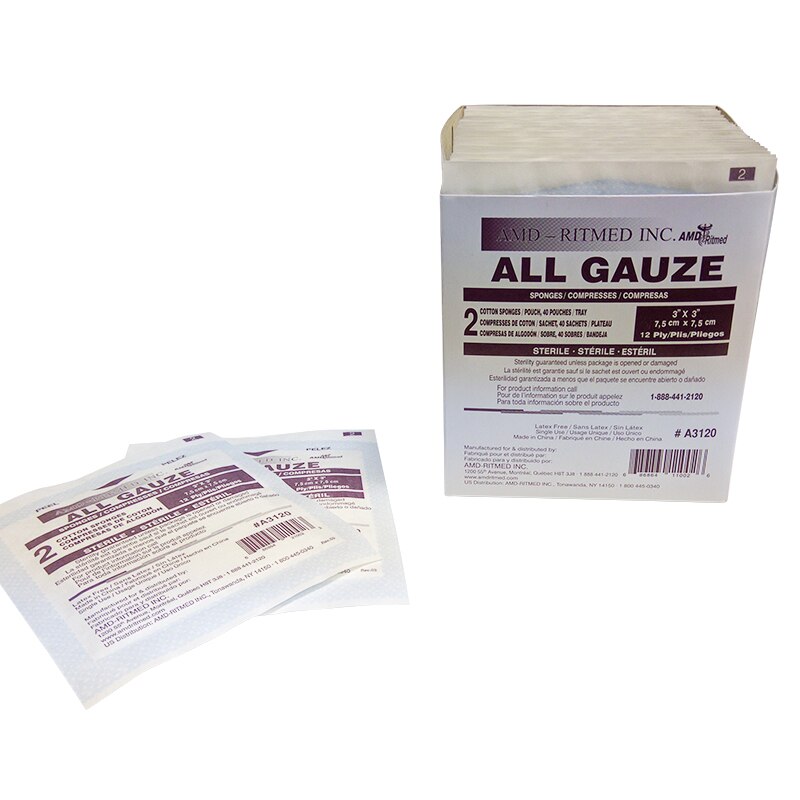 Sterile premium all gauze made of cotton. These highly absorbent, premium-grade cotton sponges provide optimal protection and patient comfort. Ideal for cleansing wounds or skin and absorbing biological fluids. 12 ply and 2 cotton sponge per pouch. 3 sizes available: .2 x 2" (50 packs of 2) .3 x 3" (40 packs of 2) .4 x 4" (25 packs of 2)
