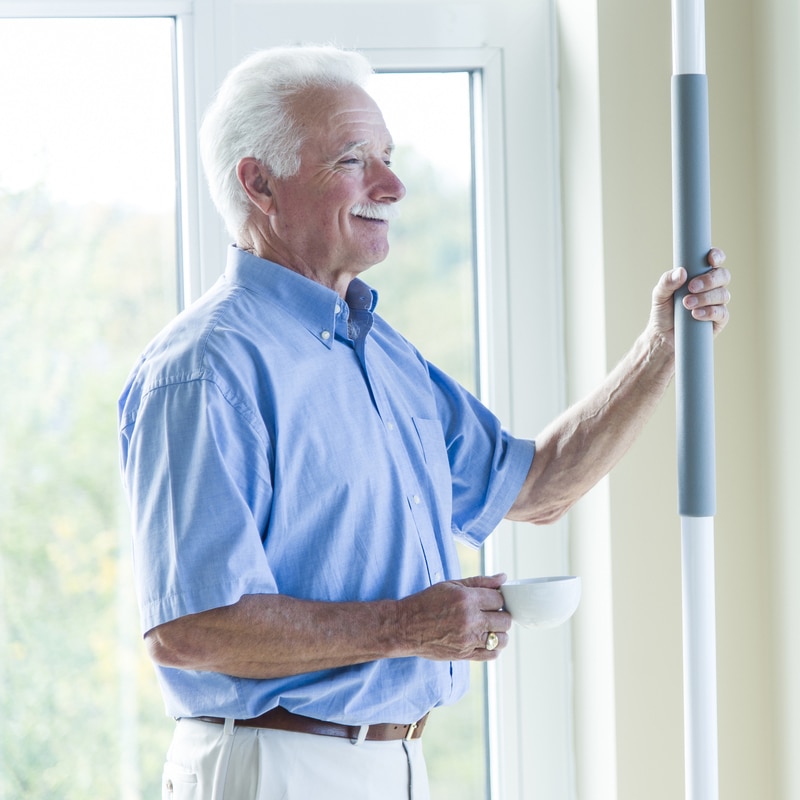 Designed for people needing a little assistance for standing or transferring. The pole is held with simple jackscrew expansion between the floor and ceiling. Rubber pads protect ceiling and floor. Height range: 93-99”. Pole is 1.5” dia. and base 5”. Made of steel with enamel finish. The pole also serves as a mounting structure to a handrail, a trapeze or tray. The SuperPole with horizontal handrail gives a great feeling of balance. The handrail pivots to provide moving support and locks when needed. Features 8 locking positions at 45°. Measures 16”. The SuperPole with trapeze helps you out of bed. Requires no special bed or attachments. The two separate rails mean that arm strength can be better used to “climb up” to a seated position. Stores out of the way when not in use. The SuperPole with tray is a compact alternative to over bed tables. Snaps on at any height or angle around the pole to provide the convenience of a bedside or over bed table. Tray measures 11 x 15.5”. Capacity : 300 lbs