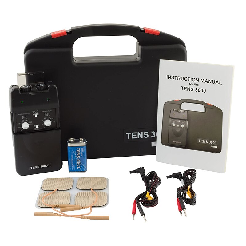 The system includes: Stimulator, lead wires, self-adhesive electrodes(4), 9 volt battery, and user manual.