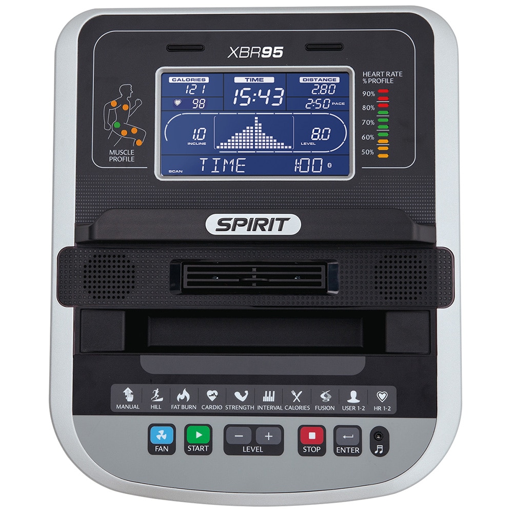 Semi-recumbent bike with bright LCD screen, adjustable console angle, cooling fan, and mesh back seat. This unit also offers six programs with extensive console feedback. It features integrated a swivel fan, tablet friendly reading rack, accessory holder, and dual drink holders into the design for maximum convenience. Features: - Oversized 7.5" bright blue LCD screen with separate Muscle Activation Profile and HR % Profile LED displays. - Contact and wireless heart rate monitoring options make your workouts more effective (chest strap transmitter not included). - Adjustable console angle, tablet friendly reading rack, and cooling fan for added comfort. Step-through frame design for easy accessibility. - Easy access fore/aft seat adjustment with large breathable mesh back seat. - Smooth and quiet drive system featuring sealed roller bearings, large diameter pulley, durable poly-v belt and heavy-duty flywheel. SPECIFICATIONS - Console: 7.5" Blue Backlit LCD w/ Tablet Friendly Reading Rack, Adjustable Console Angle - Programs: Manual, Hill, Fat Burn, Cardio, Interval, HR 1 - Heart Rate: Contact & Telemetric, (Heart Rate Strap Not Included) - Resistance: 40 Levels, Electronically-Controlled Magnetic Brake - Drive Train: Poly-V Belt w/Self-Tensioner - Power: Self-generating - Flywheel: 30 lbs., Steel - Seat: High-density foam with adjustable Mesh Backrest - Adjustments: Lever for Fore/Aft Seat and back angle - Crank: 3-Piece, Cold-Forged Steel, Case-Hardened Axle & Commercial-Grade Sealed Bearings - Frame: Commercial-Grade Structural Steel w/ Durable Powder-Coat Paint - Dimensions: 57 X 30 X 50 in - Product Weight: 147 lbs. - Maximum User Weight: 350 lbs - Commercial Warranty: Lifetime Frame, 5 years Brake, 3 years Parts and 1 year Labour.